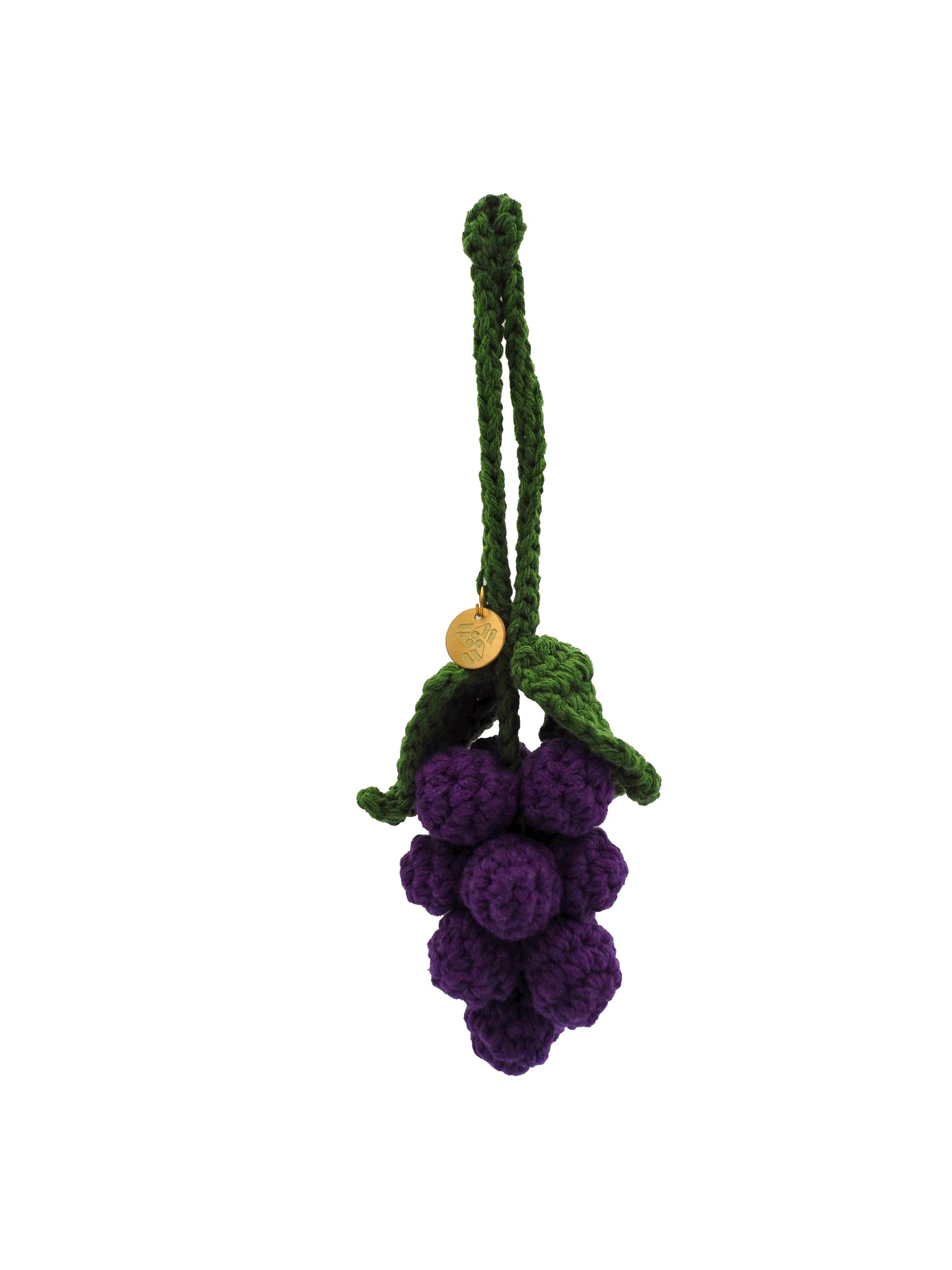 A hand crocheted grapes bag charm designed to add a sweet touch of color to your everyday life. Featuring ten grapes and two leaf accents, each piece is made using yarn spun from mechanically recycled textile waste and filled with repurposed plastic bags.