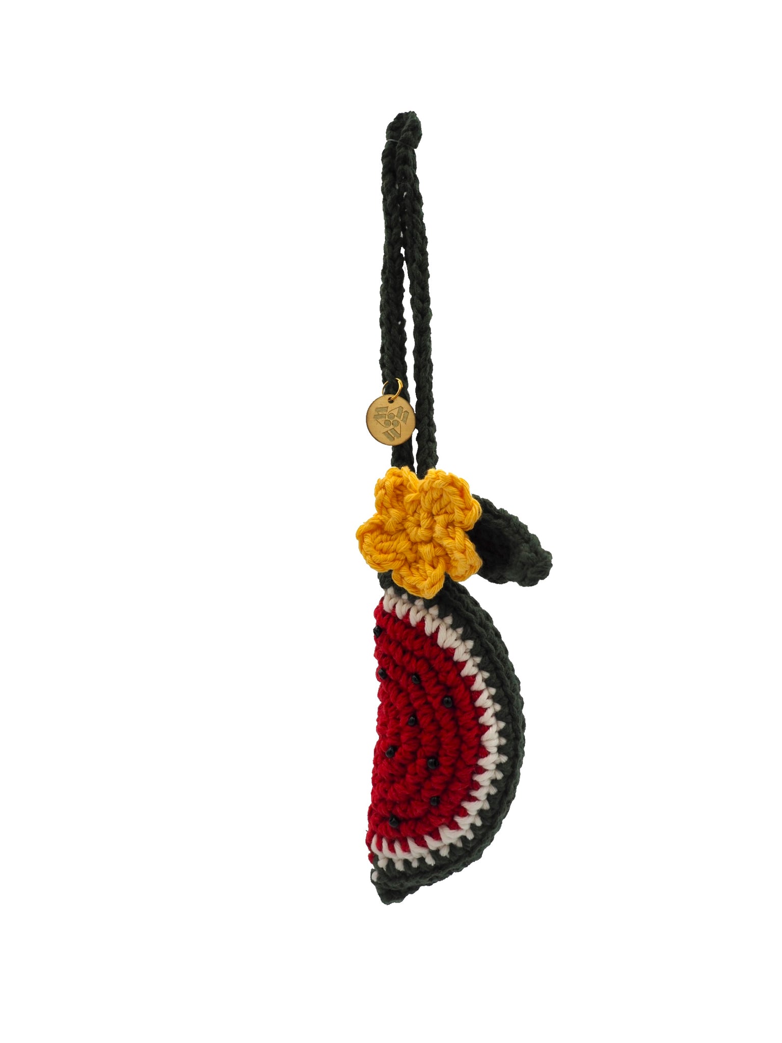 A hand crocheted chili bag charm designed to add a refreshing touch of color to your everyday life. Featuring a watermelon slice with glass bead apliques and a yellow floral accent, each piece is made using yarn spun from mechanically recycled textile waste and filled with repurposed plastic bags.